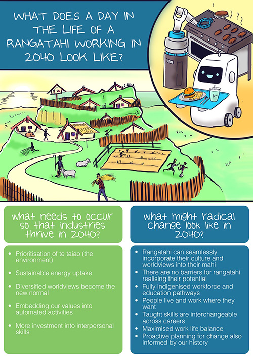 We asked pākihi Māori and kaimahi Māori who attended Tuia to imagine a future for rangatahi in 2040. How will things like disruptive weather, demographic shifts and digital disruption shape this future?