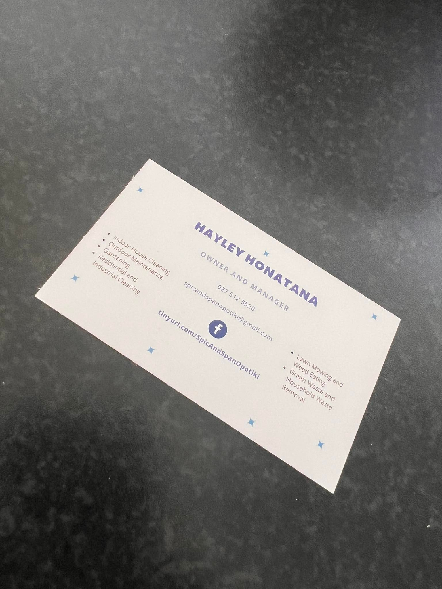 Ko Hayley Honatana ahau. I am the owner of Hayley’s Spic & Span. The business has been going since 2020.